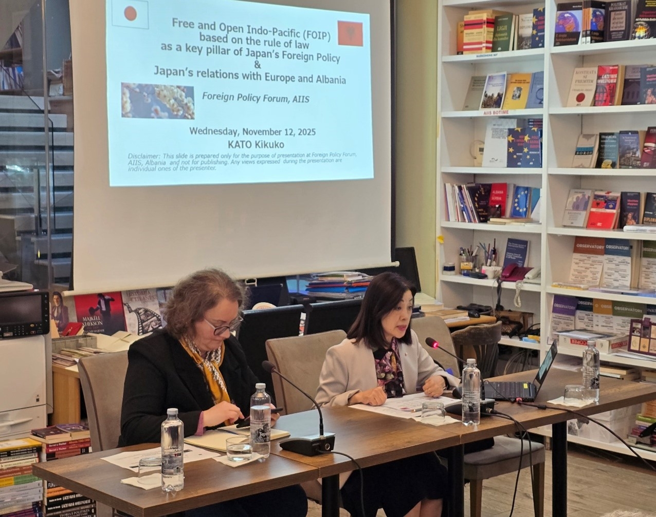 11月12日(水)、加藤大使は、アルバニア国際問題研究所(AIIS)の招待を受け、AIIS主催の外交政策フォーラム(於:Tirana Times Library)において、「Free and Open Indo-Pacific (FOIP) based on the rule of law as a key pillar of Japan’s Foreign Policy & Japan’s relations with Europe and Albania」と題する講演を行いました。