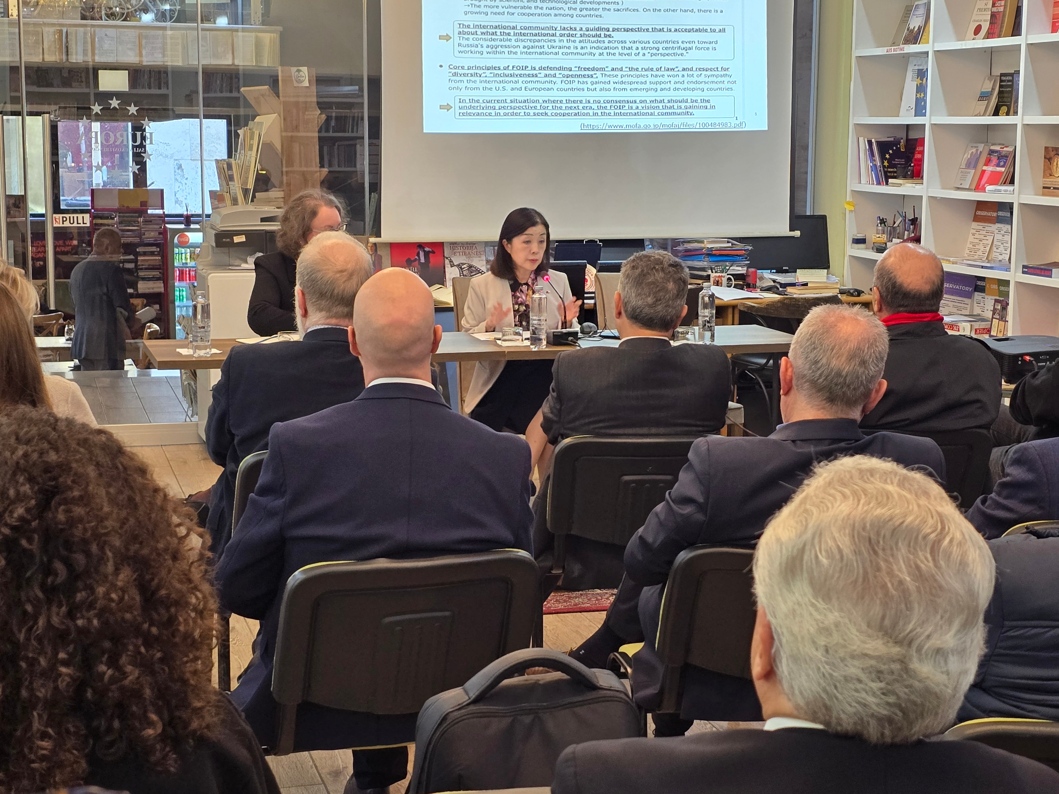 加藤大使からは、日本外交の主要な柱としての「自由で開かれたインド太平洋(FOIP)」の基本的概念やFOIPのための新たなプラン等を紹介するとともに、日欧関係及び日アルバニア関係について具体例を示しながら説明しました。聴衆は、熱心に傍聴し、活発な質疑応答が行われました。