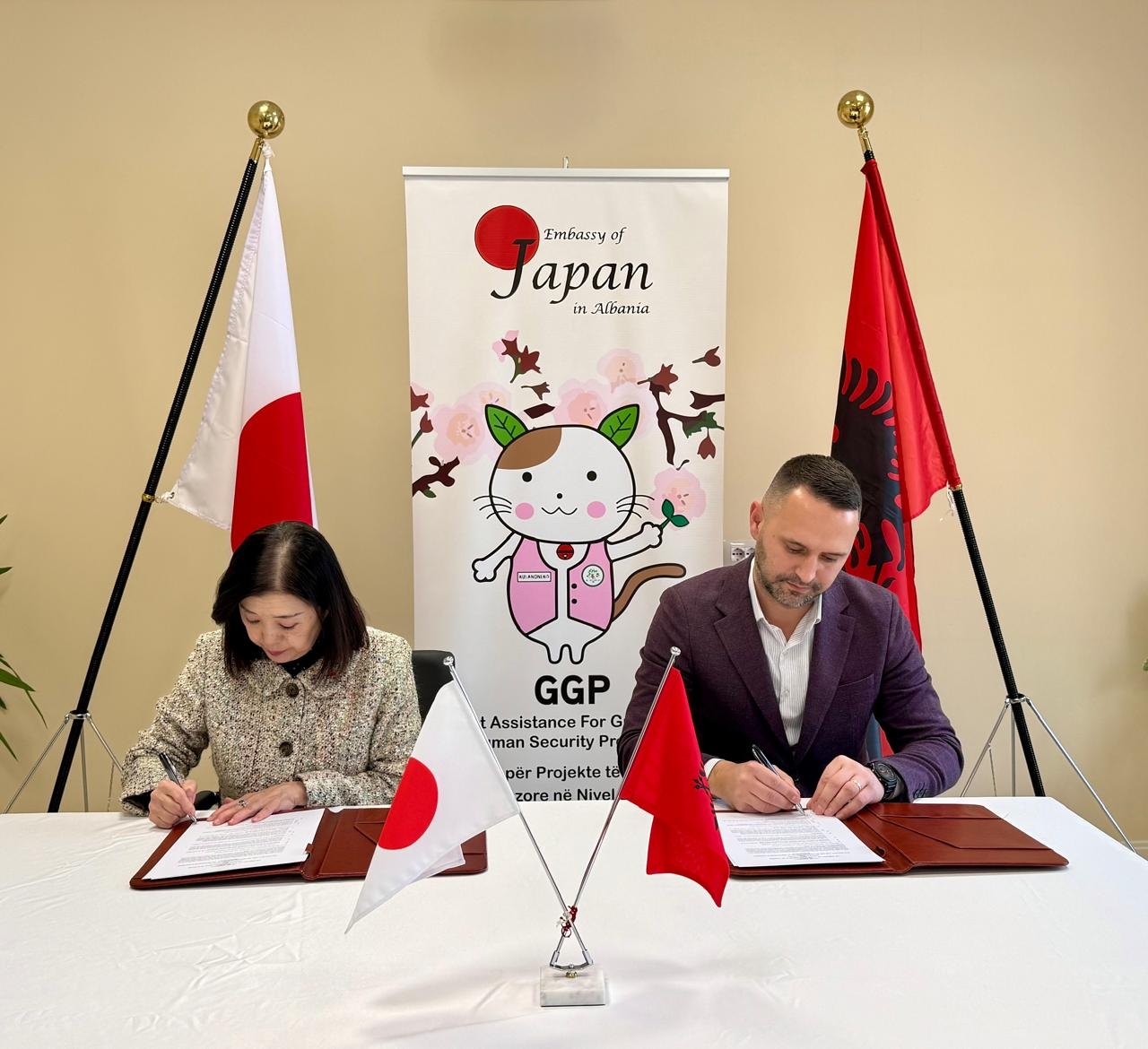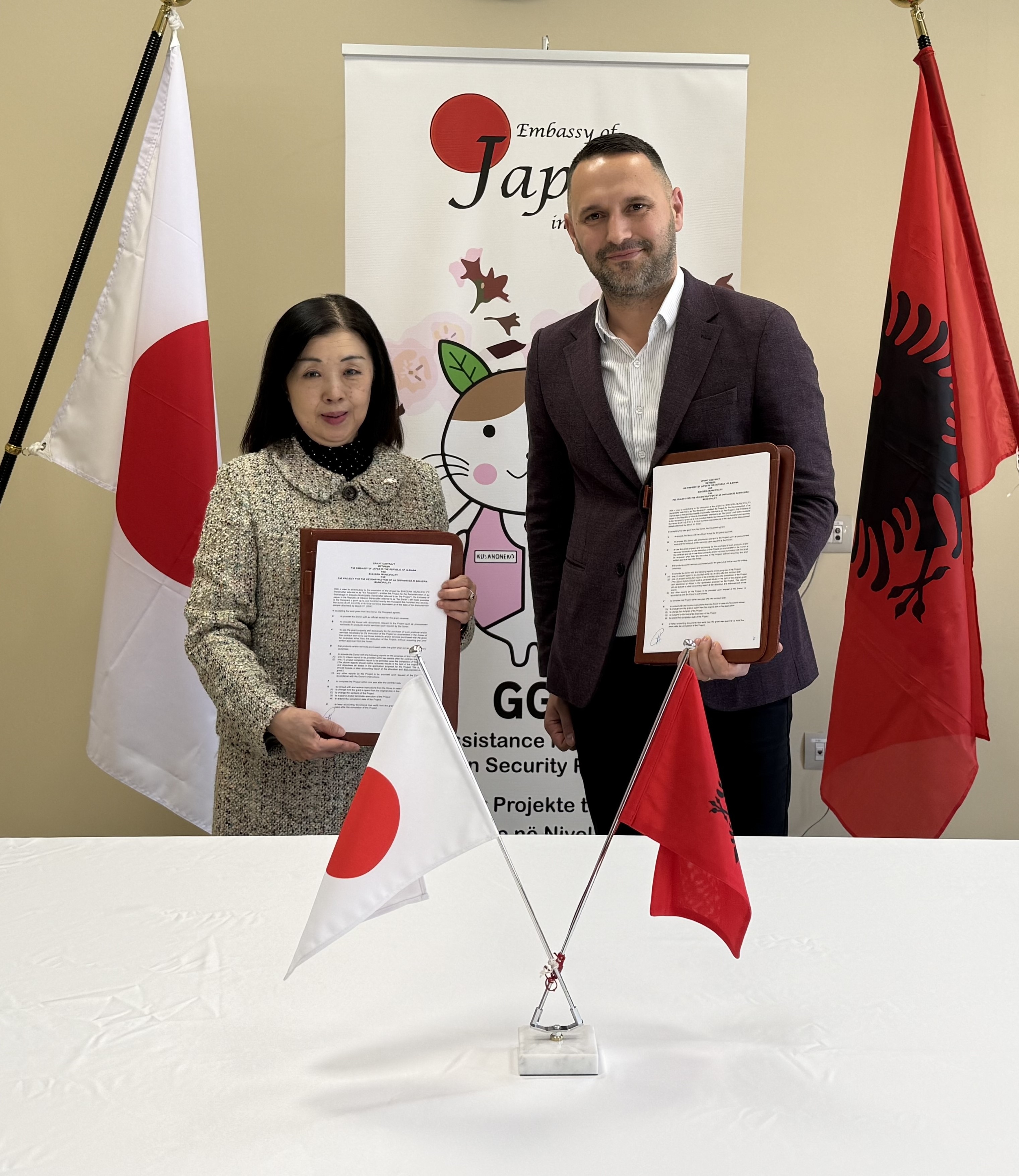 2月2日(月)、令和7年度草の根・人間の安全保障無償資金協力(GGP)「シュコドラ市孤児院改修計画」の贈与契約(G/C)に係る署名式を当館で行い、加藤大使とプレカ(Mr. Alban Preka)シュコドラ市副市長との間で贈与契約が締結されました。これにより、シュコドラ市の孤児院において建物、電気設備やトイレ等が改修され、食堂備品が整備される予定です。