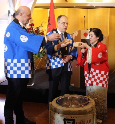 Presidenti Begaj, Konsulli i Nderit Ponari dhe Ambasadorja Kato kryen ceremoninë tradicionale të thyerjes së fuçisë së sakés (kagami-biraki) dhe më pas ngritën një dolli për të festuar Ditëlindjen e Perandorit, si edhe për të uruar vazhdimësinë e prosperitetit të Japonisë dhe Shqipërisë.